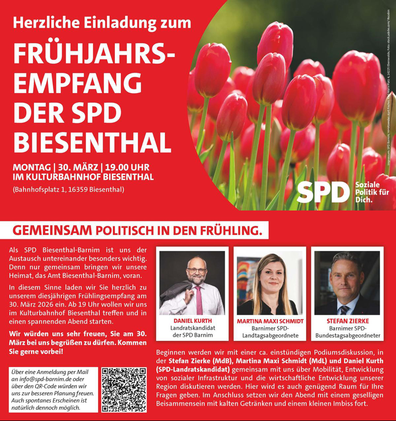 Die SPD Barnim sieht sich durch die positive Resonanz bestärkt, den eingeschlagenen Kurs fortzusetzen und gemeinsam mit den Menschen im Landkreis die kommenden Jahre aktiv zu gestalten. Auch im kommenden Jahr wird es deshalb wieder einen für alle Bürgerinnen und Bürger öffentlichen Empfang geben.